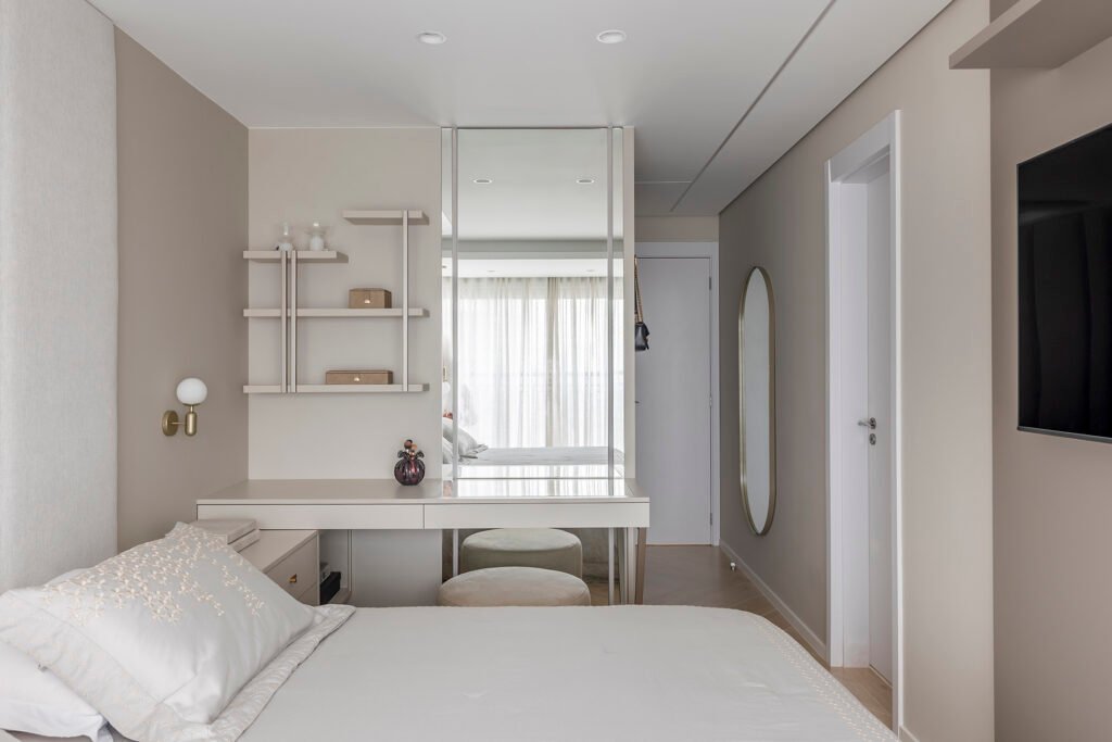 Outro recurso que não pode faltar, é o uso estratégico de espelhos. Além de ampliarem o espaço e refletirem a luz, eles adicionam um toque de sofisticação e podem ser aplicados em portas de armários ou painéis decorativos, proporcionando leveza e amplitude visual.