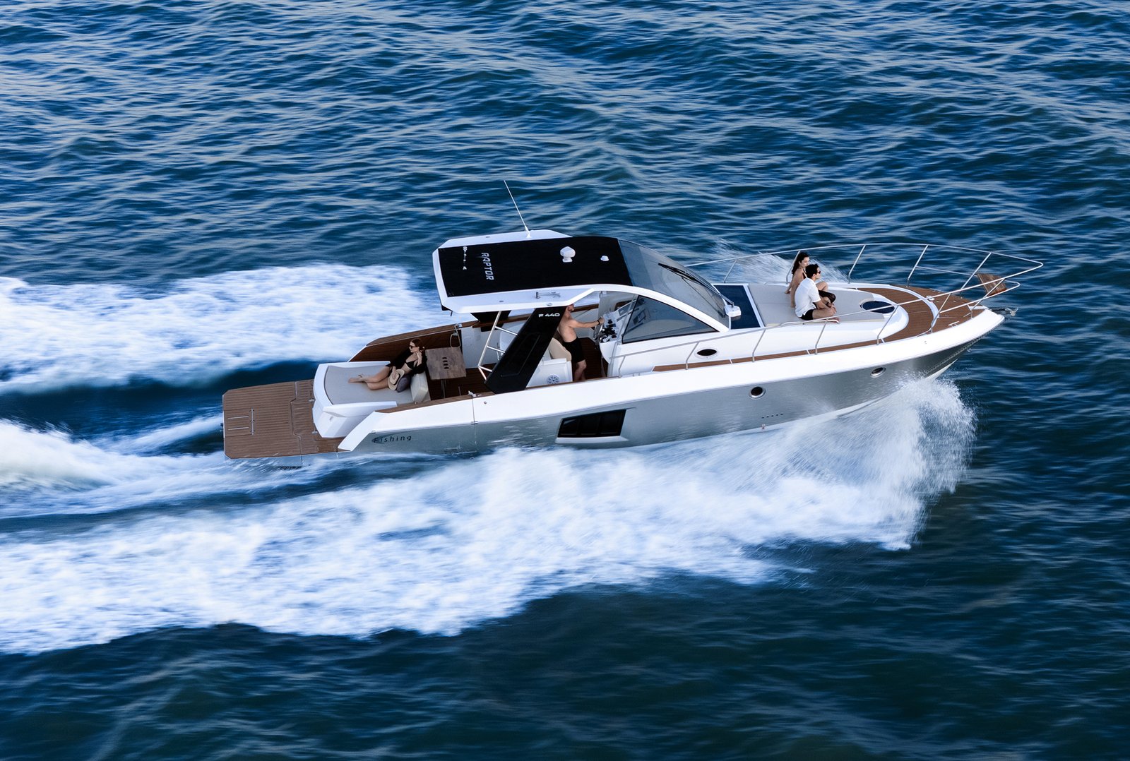 Com as portas recolhidas, a 440 Raptor faz jus ao apelido de “Ferrari dos mares”: casco em V profundo e opções de motorização que vão de três motores de popa de 400 hp a dois centro-rabeta de 350 hp, que pode chegar a 1200hp (total), combinação pensada para entregar aceleração rápida, respostas precisas ao comando e navegação em altas velocidades, em travessias mais longas ou na prática de pesca oceânica e mergulho.