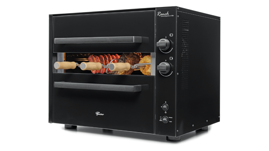 Available in versions with 3 or 5 skewers, and in built-in or countertop models, the Fischer Ranch gas barbecue adapts to the gourmet space. It has automatic rotating skewers, upper and lower doors to maintain ideal heat, infrared burners for precise temperature control, automatic ignition, internal lamp and a safety gas shutoff valve. The interior with EasyClean coating facilitates cleaning. Suggested price (07/11/2025): starting at R$ 3.399,00.