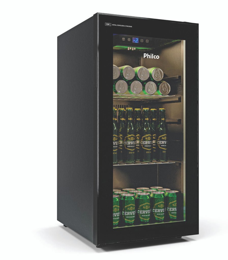 The 3-in-1 beer fridge (beer fridge, minibar and wine cooler) is compact, efficient and ideal for the consumer seeking performance with design. It has 96 liters of capacity and temperature control from -6°C to 16°C. LED lighting, adjustable shelves and a glass door with an anti-sweat system complete the modern look.